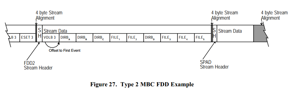 FDD 是一个流头的流 ID 字段为 'FDD2' 的流。 流头标识这是一个第二类 MBC FDD 以及跟着一系列的 DBLKs。 第二类 FDD 由 MTF_VOLB,MTF_DIRB,MTF_FILE 和 MTF_CFIL DBLKs 组成。 所有的 DBLKs 都是被封装的。 公共头的 Reserved for MBC 和 Offset To First Event fields 字段被修改。 Reserved for MBC 标识这个 DBLKs 写到的媒介号而 Offset To First Event fields 指向 FDD 的下一个 DBLK。