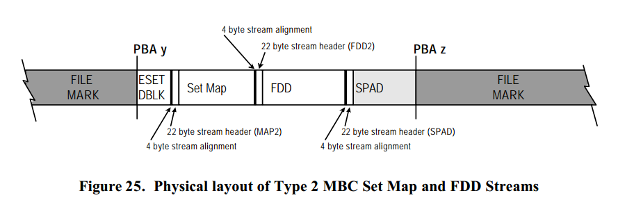 MAP2 与 FDD2 流头与标准的 MTF 流头一样 4 字节对齐并且后面跟着一个 SPAD 数据流填充到下一个物理块。 MTF_ESET 的第一个为 MBC 预留的字段用于存储 MTF_ESET 的物理块地址。