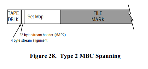 有可能在写 MBC 信息到媒介时出现遇到 EOM 的情况。 查看 结束媒体的处理 章节获取在不同情况下进行处理的详细信息。 当跨越到下一个媒介时,Set Map 如同一个关联到 MTF_TAPE DBLK 的数据流一样。